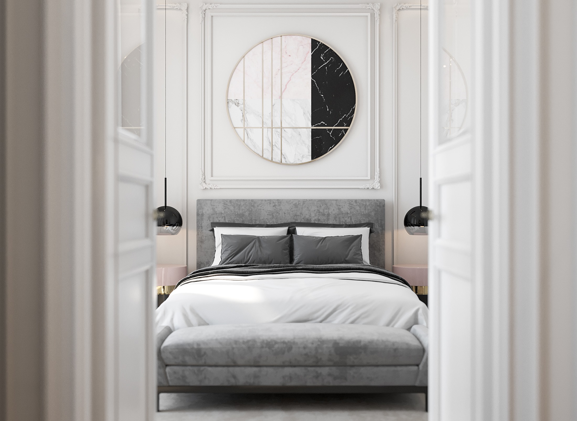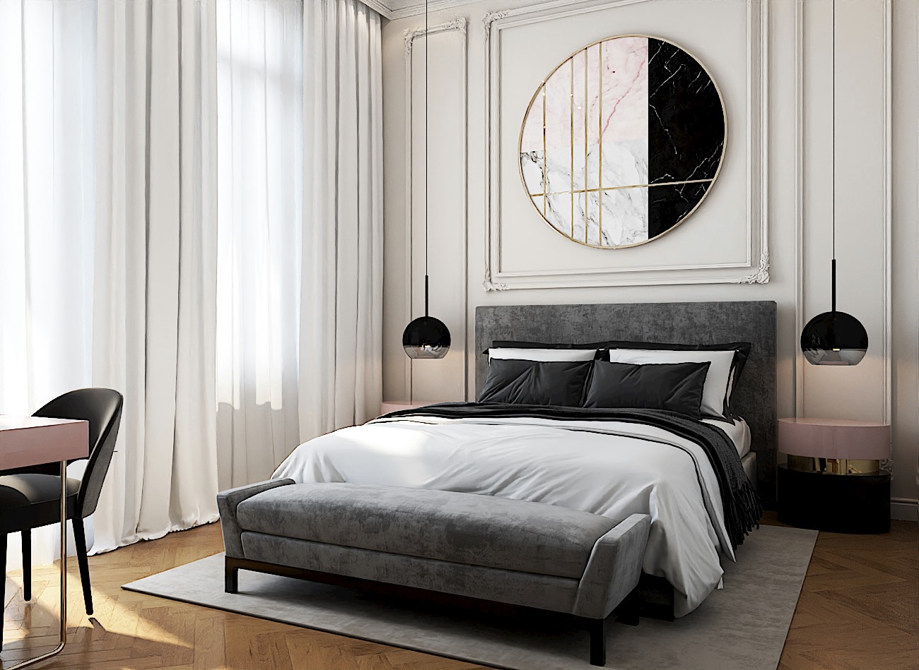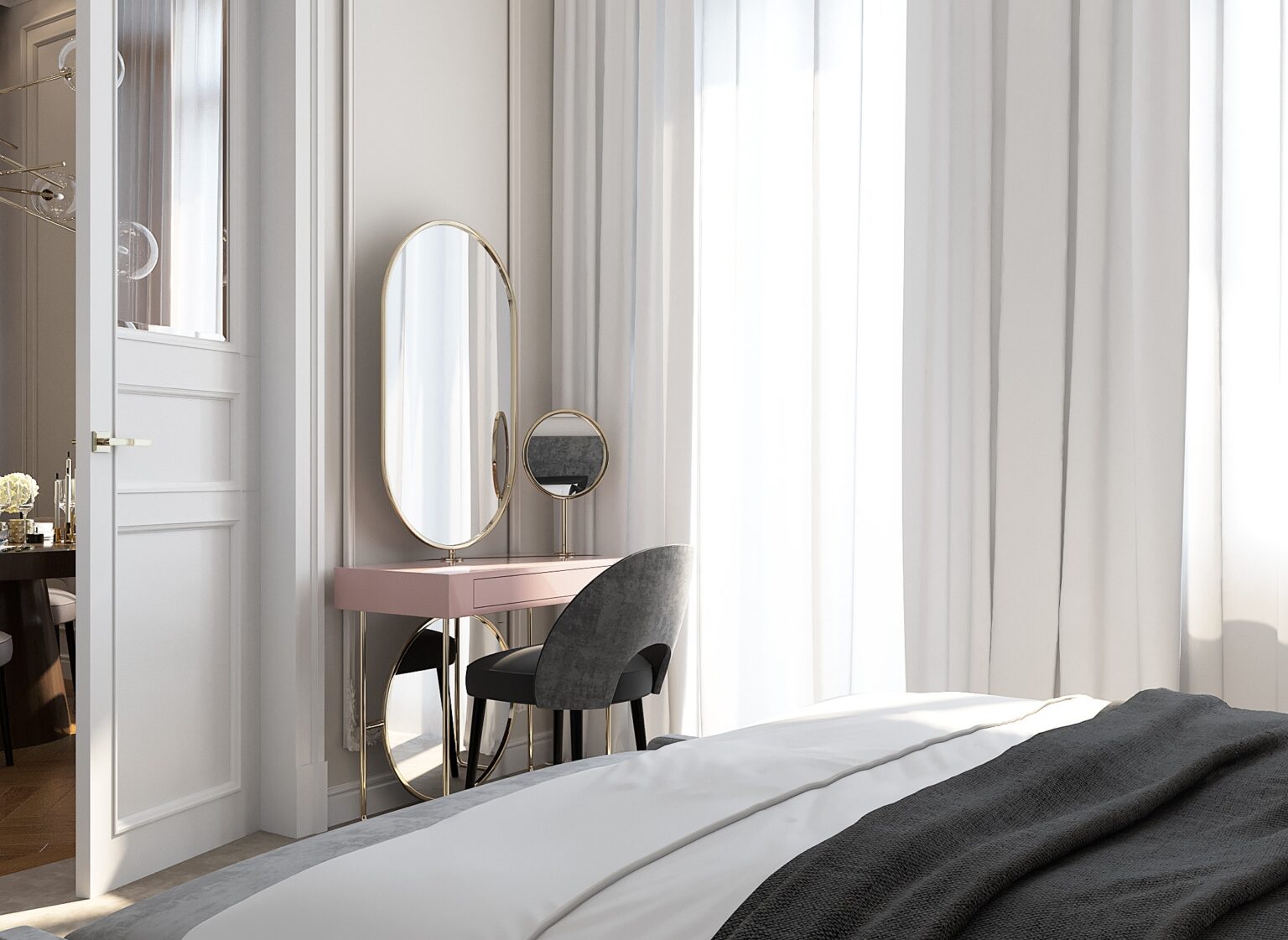 W tej realizacji odpowiadaliśmy za wykonanie tapicerowanego łóżka z wysokim wezgłowiem, ławki sypialnianej oraz krzesła przy toaletce. Każdy z elementów został zaprojektowany i wyprodukowany na zamówienie, z dbałością o spójność stylistyczną, proporcje oraz dobór tkanin odpowiadających charakterowi wnętrza.